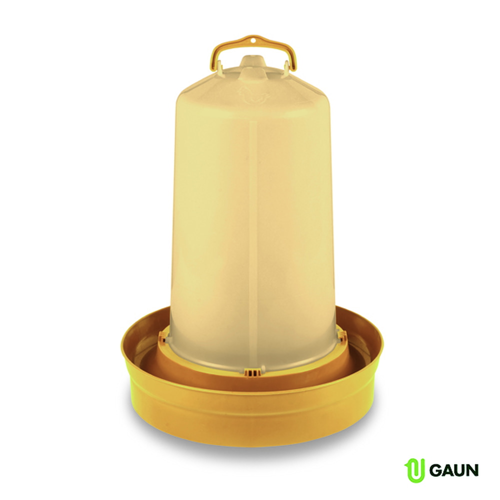Bebedero para aves premium estilo tolva. Material de plástico resistente. El agua cae desde el depósito por gravedad manteniendo siempre el recipiente base lleno, en color ORO.